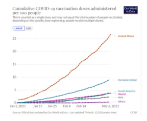 5اپریل 2021 کو، Our World In Data ڈیٹا پر موجود اعداد و شمار کے مطابق،اب تک دنیا کی 4.85فیصد آبادی کو ویکسین لگائی جا چکی ہے۔ اس موجودہ ویکسی نیشن کی رفتار سے جنوری 2025تک 70فیصدآبادی بھی مستفید نہیں ہو پائے گی۔اگرچہ یہ اعدادوشمار حیران کن نظر آتے ہیں،مگر حقیقت اس سے بھی زیادہ خراب ہے۔بہت سارے ممالک کے مابین ویکسی نیشن کی رفتار انتہائی غیر مساوی ہے کیونکہ WHOاعدادوشمار میں حقیقت کا ایک لازمی عنصرضرور چھپاتا ہے۔ مندرجہ ذیل جدول کچھ ممالک اور خطوں میں ویکسی نیشن کی رفتار کو ظاہر کرتاہے۔